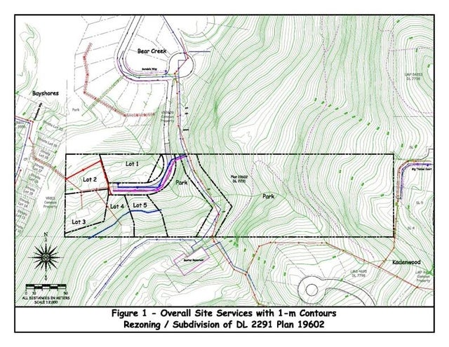 POTENTIAL. You can build on ONE LOT and leave the other 4 lots vacant for your future plans once the land is registered as a subdivision with the 5 lots laid out as per your plans. Now zoned for a subdivision of 1-5 residential lots with a tree preservation zone. The size of the detached houses zoned for development does not include a significant basement/below-grade allocation. Call the listing realtors to discuss in detail. No time specifications on buildings per RS1 zoning. Currently 3 cabins on the land. Lot 5 cabin is at the highest point and has MAGNIFICENT panoramic mountain views to the north and south. The south view and the elevation means extended sunshine on location. Ski home from Whistler Mountain via Kadenwood and Bayshores Trail to lot 5 or to the entrance of development.